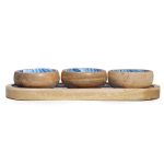Vsak kos je izdelan iz visokokakovostnega mangovega lesa, ki je znan po trpežnosti, naravni odpornosti in izjemno lepem lesnem vzorcu. Trije vložki se popolnoma prilegajo pladnju, kar omogoča estetsko in praktično serviranje prigrizkov, omak, oreščkov ali namazov.